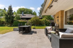 Der er plads til de helt store armbevægelser i haven, som er ganske ugeneret og solrig. I vil spendere mange timer på den sydvestvendte terrasse med varmelamper og en markise, hvor grillmiddage klargøres, alt imens børn og barnlige sjæle tumler omkring på den store græsplæne. Der er også en hyggelig bålplads og en dobbelt carport.
